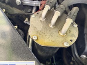 燃料漏れ、ディーゼル用の燃料フィルターケースのパッキンからの漏れか、今回は取り付けボルトの増す締めでご対応させていただきました。