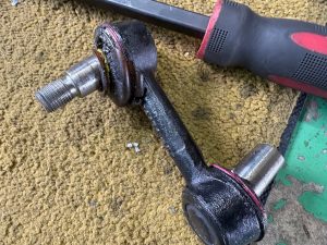 フロントスタビライザーリンクロッドのブーツが破れておりました。ジャガーやアストンマーティンもそうですが、ブッシュ廻りにシリコン系の材質を使うことが多いみたいで、写真のように硬化して破れてしまいます。