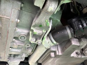 エンジンのウォーターラインの配管より漏れていました、スチール製の頑丈な材質の為、通常漏れることはないと思いますが、生産時の不具合?なのか取付ボルトが取れており、取付ブラケットを溶接している部分がエンジンの振動でグラグラ動き溶接部分が其れに耐え切れなくなりクラックが入ってしまった感じです。ちなみにこの配管を取外すのにはエンジンを一旦おろす必要があり、大掛かりな作業になってしまいます。