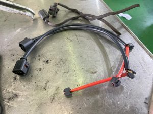 9PAカイエンのブレーキパットセンサー、左右に装着してあり、両面ともセンサーがついているので、パットが変摩耗しても交換のメッセージが点灯します