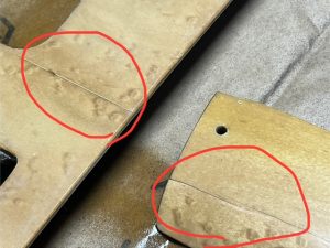 クラック部分はわかりますが、これが柄だと思えばいいかなと思います。突板ごと交換すると結構値段アップします汗