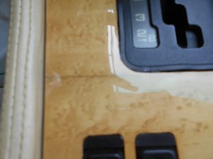 法定12ヶ月点検、エンジンオイル&フィルター交換後、今回のご依頼のウッドパネルのリペアと古いオーディオ機器の取り外しのご依頼です。卓上式のナビモニターをつけておりましたが、モデルも中途半端に古くて見栄えも悪いため取外し、バックモニターは小さい画面に変更してさりげなく取付しました(写真ありませんが)、ウッドパネル修理に関しましては突板からの交換ではなくて、クラック部分をリペア方法にさせていただきました。基本的には突板自体が剥離してしまっているために研磨して表面を塗装するしかなく、クラック部分がわかりますが、それがデザインだと思えばいいかなということで。