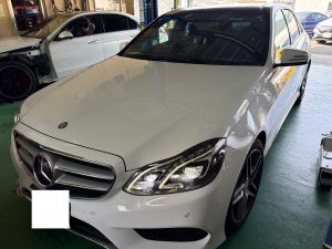 メルセデスベンツW212 E350ディーゼルのタイヤパンクでレッカー搬送されてきました。