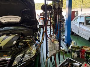 メルセデスベンツE350ディーゼル S212系のフロントガラスが曇るとのことでお預かり。