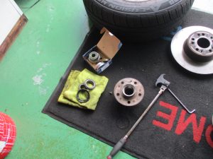 フロントホイールベアリングの交換とブレーキディスク&パットの交換作業です。