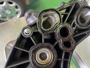 オイルフィルターハウジングはオイルクーラーも併用しており、オイルと水のラインで層が分かれおります、高温になる部分でかつ樹脂製ですので、年数が経過すると劣化するのは必然であります。ガスケット交換だけでは改善しない状況でしたのでフィルターハウジングAssy交換で進めさせていただきます