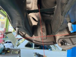 ダウンサス交換ということでリフトアップして、下回りをチェック、フロントスタビライザーバーに擦傷が入っており、念のため寸法をチェックさせていただきました。↑の画像は左フロントですが↓と比べると少し位置がずれております。