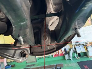 スタビライザーバーの右より部分が強く損傷しているようで、右スタビライザーリンクロッドが曲がっておりました。こちらは交換ではなく修正でご対応させていただきました。
