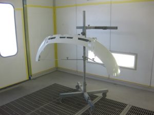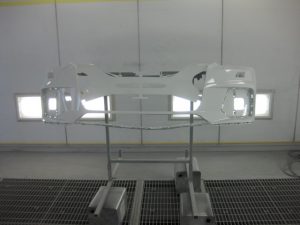 フロントバンパーに、フロントフェンダーアーチモールが装着されており、貼付タイプの為交換させていただきました。新品部品は未塗装品の為、こちらも塗装させていただきます。