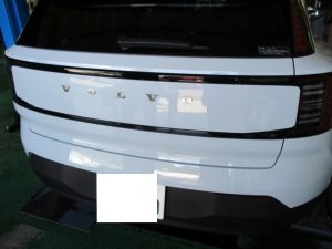ボルボEX30 フルエレクトリックの車両です。リアゲートの凹みの修理で入庫しましたが、裏面から手が入りそうなので、デントリペアで修理します。