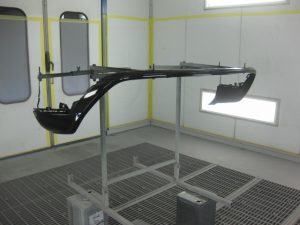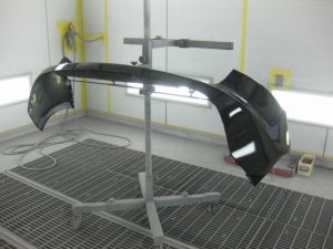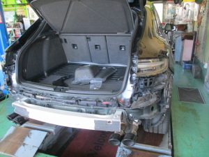 バンパーフェイスの構成部品を取外して修理、バンパーは上下に分かれるので、各パーツごとに修理します。