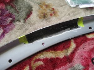 フロントリップのクランク部分に亀裂がはいってしまっておりました、クラックが入っている部分は補強を入れて、表面はエポキシ製の接着剤で修理します。