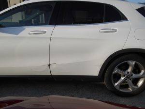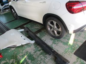 メルセデスベンツ X156系GLA180の左サイド部分の事故修理のご依頼です。メルセデスディーラーの見積が高額な為、弊社にご相談いただき、価格を下がる方法での修理をご提案させていただきました。