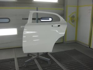 左リアドアは交換が必要な損傷でしたので、リサイクルパーツをご用意させていただきました。まずはリサイクル部品の凹んでいる部分の板金修理から。