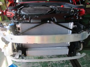 ラジエター、コンデンサー廻りを取外していくと、エンジンオイルクーラーが損傷しておりました。