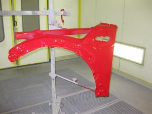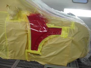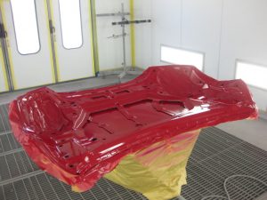 外装パネルの交換、ボンネットは直撃しており修復は無理、新品のボンネットをペイントしていきます、まずは裏面を塗装して~表面を塗装。