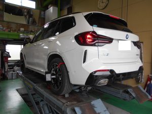 BMWX3(G01系)の左側面事故修理のご依頼です、車両保険を使用しての修理になります。